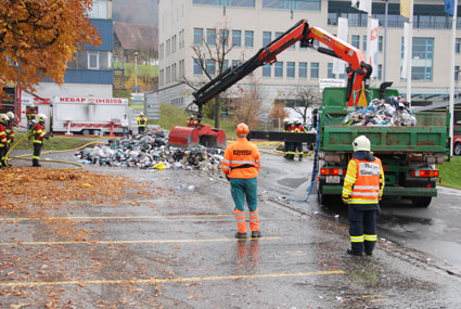 Der Inhalt des Containers eines Kehrichtfahrzeuges geriet in Brand. Der Fahrer deponierte den Container geistesgegenwärtig, so dass weder er noch das Transportfahrzeug Schaden nahmen. Unter Atemschutz konnte die Feuerwehr den Container leeren und den brennenden Inhalt löschen. Durch eine Spezialfirma wurde der gelöschte Kehricht anschliessend in eine Mulde geladen und entsorgt.